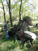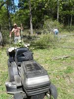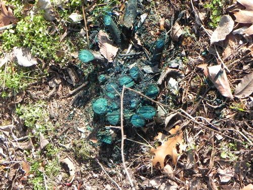 The stumps of large multiflora rose bushes are carefully treated (hand painted) with a formulation of 25% Crossbow herbicide, 75% diesel fuel to prevent regeneration of growth. A blue die is added to the formulation to assure all stumps are treated.